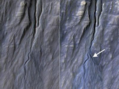 新出现的火星沟壑 (神秘的地球)这左右两栏中的图像由美国宇航局火星勘测轨道器...