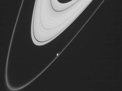 土星外围环系统特写,从中可以看出F环上附近的土卫十六普罗米修斯和A环上的神秘亮...