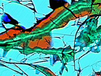 这是拉法耶特陨石切片的伪彩色图像,叠加了X射线图像下的硅(绿色),铁(红色)以及...