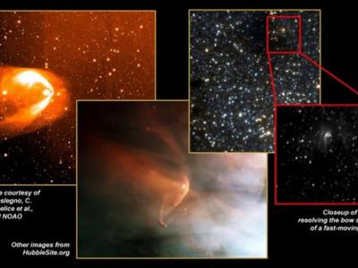 由美国宇航局空间望远镜拍摄到高速运行的恒星周围出现“弓形激波”的情景 发射于...