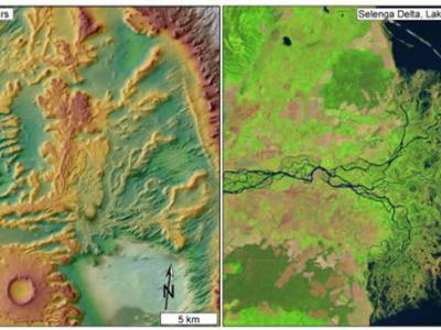 两颗行星的对比:左侧:彩色地形图,展示在火星Aeolis Dorsa地区一片被科学家们认...