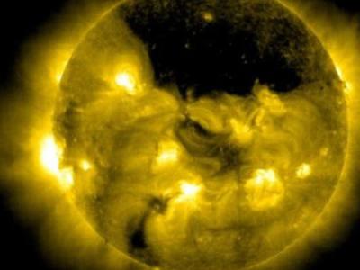 由太阳和日光层探测器拍摄到的太阳极区冕洞现象,这里的温度比周围要低一些 欧洲...