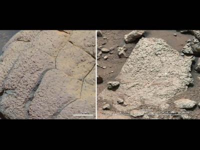 这两张照片对比了机遇号火星车以及好奇号火星车在火星两个不同地点发现的岩石。图...