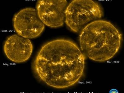 这六张图片是从太阳动力学观测站(SDO)选来的,代表着每六个月的太阳活动情况。太...