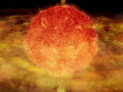 这位艺术家的概念展示了一个假设的事件,称为超千新星。一颗大质量恒星在超新星爆炸...