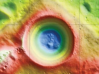 这是沙克莱顿陨石坑的激光高度图,采用了假彩色来标示不同的高度,蓝色表示最低处...