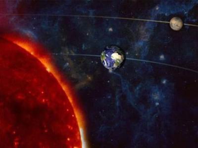 天文学家描绘火星冲日,火星和太阳位于地球的两边 火星冲日时,太阳、地球和火...