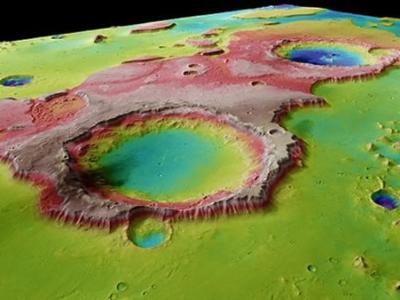 火星快车探测器拍摄的火星表面图像,不同色彩显示出地质结构的海拔不同,暗示着蒂...