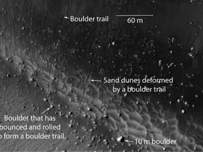 通过研究火星表面悬崖上落下的石砾以及留下的滚动轨迹,科学家发现近期火星震的证...