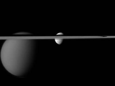 土星环同时穿过土卫六(左)和土卫三 “卡西尼”号飞船捕捉土卫三(小)的图像...