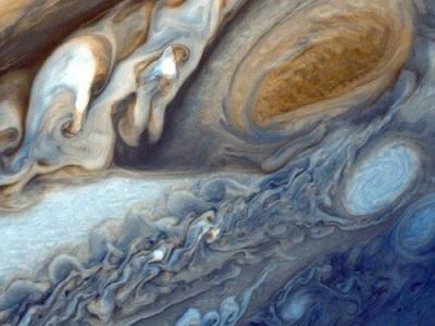 旅行者1号探测器拍摄的图片,在右顶端可以清晰地看到大红斑 木星云层图 卡...
