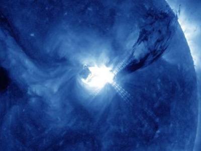 太阳黑子活动区爆发强耀斑 这张来自国际空间站的图像显示,太阳耀斑引起地球上...