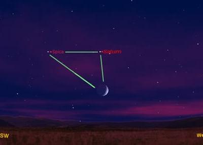 月球、土星和室女座阿尔法星夜空中构成超大的三角形 在2011年8月3日的天空中,月...