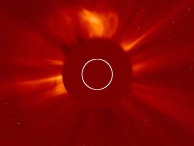 日冕物质抛射与太阳色球层的混合图像。图片来源:uux.cn/SOHO—ESA & NASA(神...