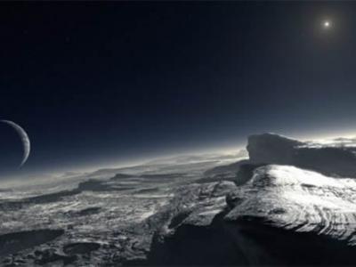 这是一幅艺术想象图,在冥王星表面可能看到的情景。在其地表可以看到一层凝结的白...