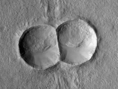 这张图片显示,两个对称的重叠陨石坑一定是在同一时间形成 鼻涕虫形状的陨石坑...