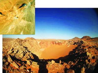 在埃及发现的45米宽的卡米尔陨石坑(小图为鸟瞰图)提供了证据,表明小型铁陨石有...