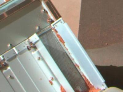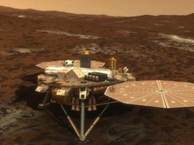 正在火星表面工作的热力与先进气体分析仪(TEGA)。机械臂上的铲子已经把火星土样...