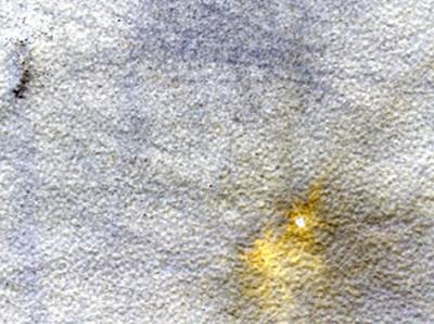 一颗小陨星碰撞暴露出近乎纯净的冰(黄褐色污迹中的白点)。 凤凰号探测器让地球...