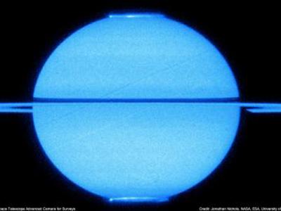 在这张采用哈勃空间望远镜先进巡天相机拍摄的照片上,土星两极都可以见到极光,拍...
