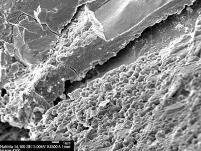 通过电子扫描显微镜观测到的这张火星陨石照片,图中的凸起同微小细菌形成的微化石...