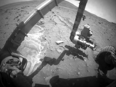 “勇气”号火星车。2009年10月11日,“勇气”号火星车拍下它前方的机械臂和周围环...