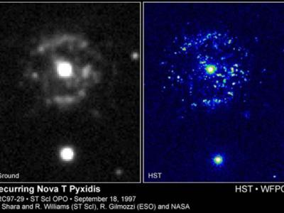 本图是分别由基地望远镜和“哈勃”太空望远镜所拍摄的“罗盘座T星”的照片。这颗...