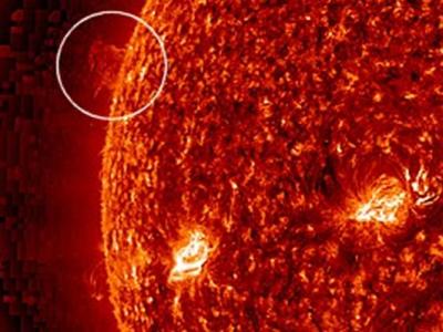 “舞动的日珥”(画圈处)。在遭受昏暗但强有力的太阳海啸冲击后,日珥上下波动 ...