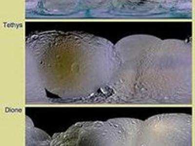 图片中依次是土卫一、土卫二、土卫三、土卫四和土卫五阴面半球的表面成像 据美国...