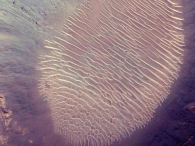 图片展示的巨指纹位于火星Coprates 地区Fan附近的一个陨坑内。这个巨大的指纹状结...