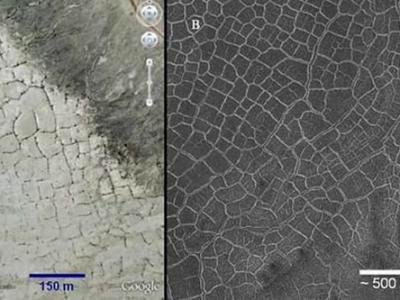 图片左侧是地球上干涸裂纹;右侧是火星陨坑底部的干涸裂纹 近距离观测火星陨坑...
