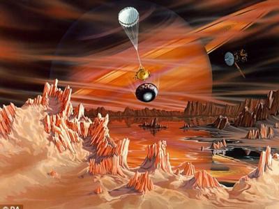 艺术家绘制的土卫六提坦上连绵的沙丘和山脉 艺术家绘制的提坦上诡异的甲烷湖 ...
