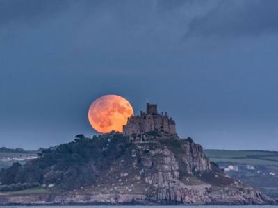 月食发生之初,超级月亮渐趋暗红色。 血月映衬着英国利物浦市的象征“利物鸟”...