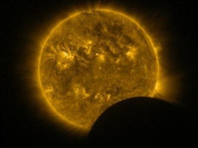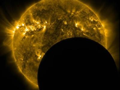 这是一幅太阳动力学天文台(SDO)拍摄的图片,月球恰好经过太阳面前 这是一张由美...