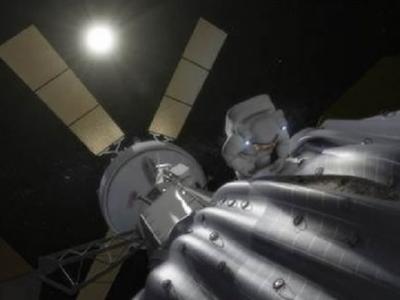 艺术家绘制的捕获小行星情况,NASA的宇航员正在猎户座飞船外作业 据腾讯科学:未...