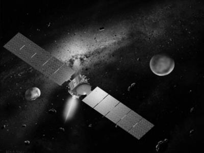 “黎明”号探测器绕灶神星(左)飞行想像图,右侧为谷神星。 一颗曾经很神秘的小...