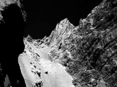 由于拍摄时太阳正好位于罗塞塔飞船的后方,阳光下罗塞塔飞船的影子印在彗星表面,...