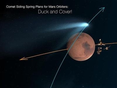 赛丁泉彗星掠过火星的构想图 NASA的无人太空船将躲在火星后方,避开彗星尘。 ...