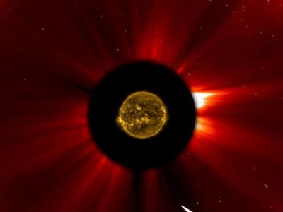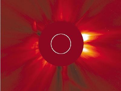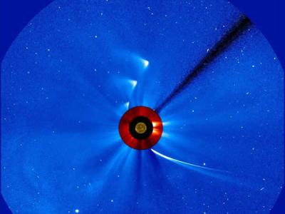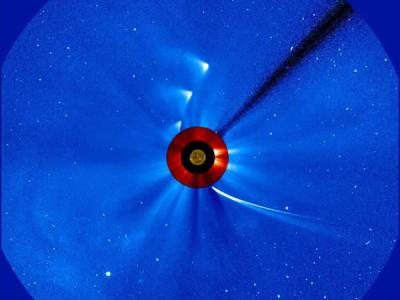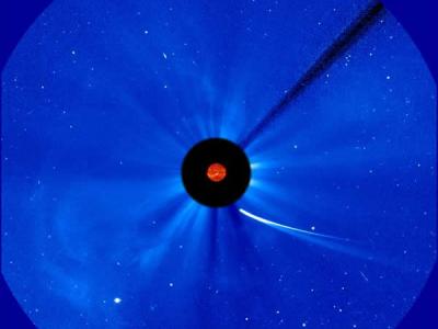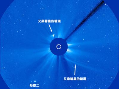 SOHO太阳观测卫星C3日冕仪于台北时间11月29日8:18的影像,可清楚看到艾桑彗星的...
