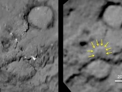 这是2005年深度撞击计划中,坦普尔-1号彗星彗核遭受撞击的部分区域照片。左侧图像...