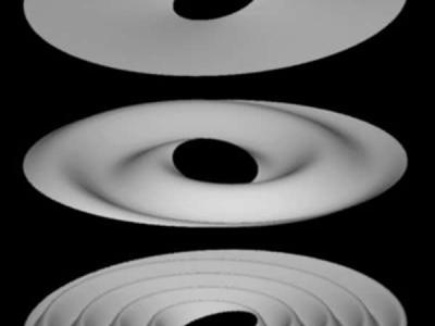 这一连串的图像显示了垂直波纹如何可以从一个最初倾斜环产生。在最上面的图片显示...
