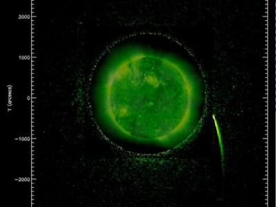 日冕物质抛射与太阳色球层的混合图像。图片来源:uux.cn/SOHO—ESA & NASA(神...