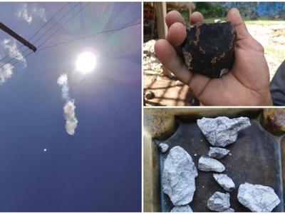左图:阳光旁边有长形烟团留在空中。右上及右下:疑似陨石碎片...