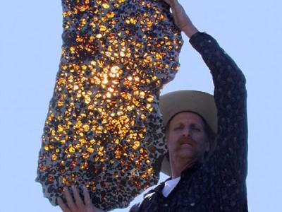 美国亚利桑那州西南陨星实验室的马文-基尔戈尔举起“富康陨石”,阳光可照射穿透...