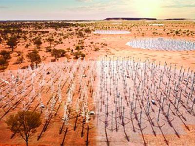 平方公里阵列射电望远镜将在澳大利亚竖起13万条有线天线,用于收集低频信号。图片左...
