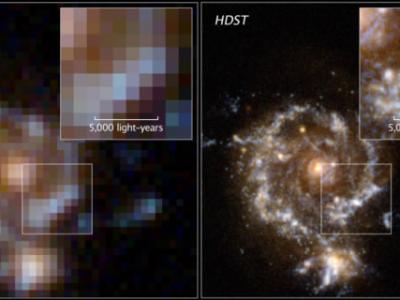 哈勃太空望远镜观测的星系图像(左);新型太空望远镜观测到的图像(右)(模拟图...