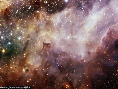 FLAMINGOS-2相机拍摄到天鹅星云,该星云距离地球大约5200光年,图中显示年轻炽热...