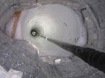 冰立方工程师正在用热水钻开凿后的冰洞里架设光学感应器 冰立方中微子探测器整...