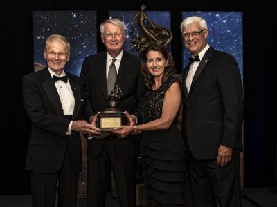 图为,从左至右:美国宇航局局长比尔·纳尔逊;全国航空协会主席吉姆·阿尔博;诺斯...