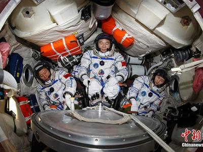 神舟九号航天员乘组指挥长景海鹏(中)、航天员刘旺(左)、航天员刘洋(右)模拟...